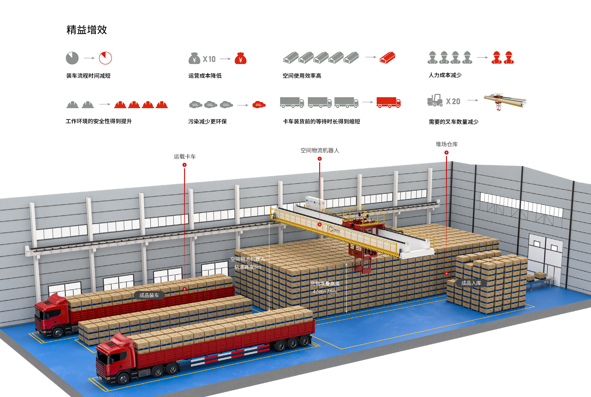 革新堆場物流分揀領域的空間物流機器人,正以一場技術革命的姿態,徹底顛覆了長久以來依賴人工叉車的傳統分揀模式,填補了國內外在這一領域的空白。該機器人設計秉承了“降維融合”的創新理念,將尖端科技精心封裝,化繁為簡,打造出如同家用電器般便捷易用的標準產品。這一創舉不僅在成本控制上實現了飛躍,更在作業效率上對傳統物流方式形成了壓倒性優勢,引領物流行業邁向智能化、高效化的新紀元。